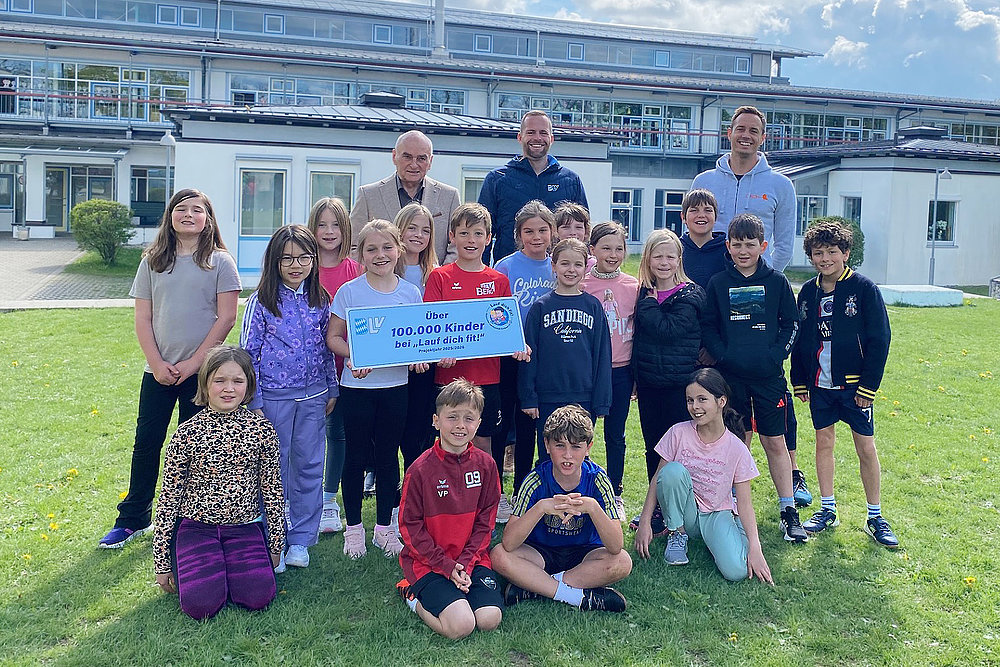 Mit der Anmeldung der Oskar-Maria-Graf-Grundschule in Aufkirchen bei Starnberg wurde die Marke von 100.000 Kindern für dieses Schuljahr überschritten. Ein Grund, weshalb BLV-Geschäftsführer und Projektleiter Peter Kapustin sowie BLV-Präsident Gerd Neubauer an die Grundschule nach Aufkirchen fuhren, um das 100.000er-Schild persönlich zu übergeben. Die Grundschule mit ihren 230 Schülerinnen und Schülern unter der Leitung von Frau Dr. Rogosch nimmt seit dem ersten Tag am Projekt teil. Das Schild wurde an Schüler der 3. Klasse mit ihrem Sportlehrer Raphael Haas übergeben.
