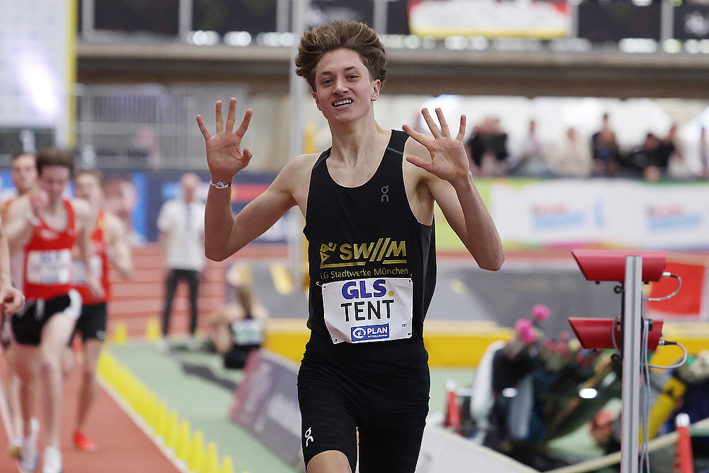 Im Laufbereich ist Tobias Tent (LG Stadtwerke München) der Aufsteiger dieses Winters. Mit seinem bayerischen Rekord über 1.500 Meter hat sich der Zwanzigjährige an die nationale Spitze vorgekämpft. Dieses Selbstbewusstsein zeigte er auch im Finale über 1.500 Meter. Dort drückte der Top-Favorit Marius Probst vom ersten Meter an das Tempo. Mit starken 3:40,69 Minuten sicherte sich Tent die Silbermedaille. Seine Rennanalyse zeugt von Selbstvertrauen: „Marius hat das Rennen brutal schnell gemacht. Nach 400 Metern dachte ich: ‚Ach du meine Güte, hoffentlich wird der bald langsamer.‘ Aber ich konnte es durchziehen.“