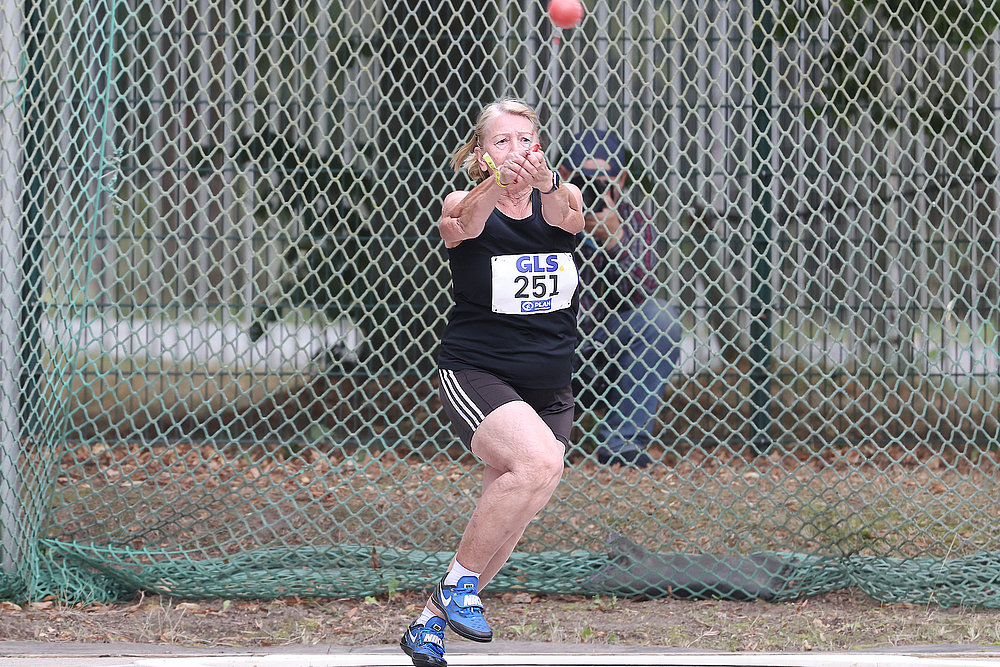 Eva Nohl (TSV Langenzenn), „Masters-Leichtathletin des Jahres 2024“, ist in der Altersklasse W75 nach wie vor eine feste Größe, wenn es um Titel im Winterwurf geht. Nach ihrem Titelgewinn im Gewichtwurf sagte sie: „Ich habe heute Nacht zwar schlecht geschlafen, mich aber dennoch auf diesen Wettkampf gefreut. Meine neuen Wettkampfschuhe habe ich zum ersten Mal angezogen und war von Beginn an sehr locker.“ Genauso locker gewann sie auch den Titel im Hammerwurf.