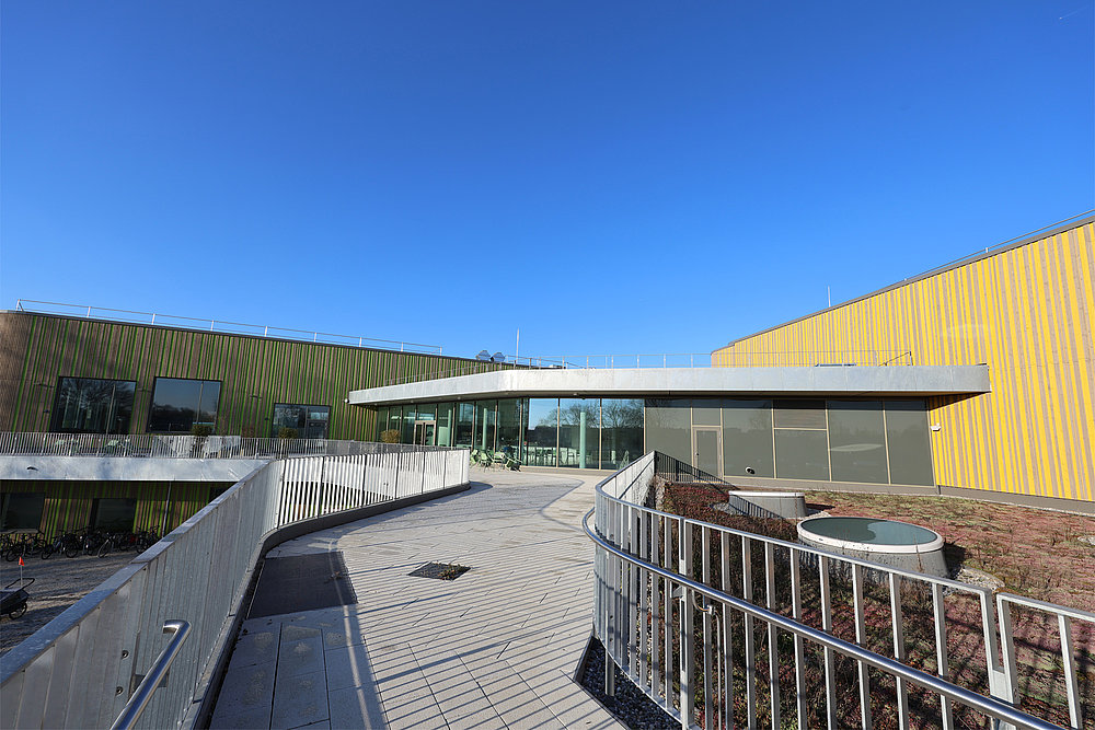 Das 55-Millionen-Projekt der Stadt Regensburg haben die renommierten Behnisch Architekten geplant. Von ihnen wurde auch der Münchner Olympiapark entworfen und der Umbau der Münchner Werner von Linde Halle. Beim Projekt in Regensburg wurde auf nachhaltige Materialien, hocheffiziente Technik und erneuerbare Energiequellen gesetzt. Die Solarkollektoren, die über den Parkflächen des Sportparks installiert werden, sollen den Wärmebedarf des gesamten Sportparks decken. Auch die Optik kommt nicht zu kurz: Gelb und Orange sind die dominierenden Farben im Inneren der Halle. Dieses Farbkonzept erstreckt sich auch auf die Fassadenkonstruktion. Durch die gemeinsame Holzverschalung werden die beiden Gebäude als Einheit wahrgenommen.